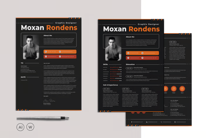 Энэхүү тод болон хүчтэй нөлөөтэй намтрын загвар нь гөлгөр хар дэвсгэр дээр эрчтэй улбар шар өнгийн хэсгүүдтэй хослуулан, дизайн мэргэжилтнүүдэд зориулсан хүчтэй визуаль илэрхийлэл үүсгэдэг. Орчин үеийн геометр элементүүд болон өндөр-контраст дизайн нь таны хувийн брэндэд тэргүүлэх үзэмжийг нэмдэг.