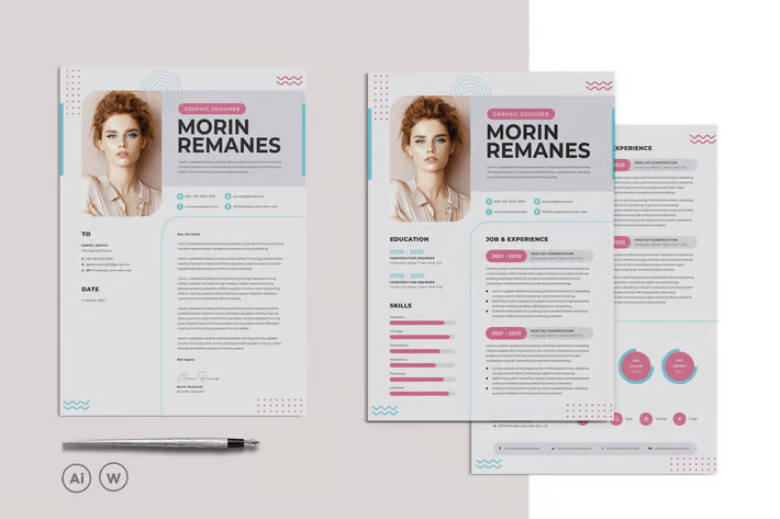 Энэхүү зөөлөн болон орчин үеийн намтрын загвар нь цэвэрхэн цагаан дэвсгэр дээр нарийн ягаан болон оюу өнгийн хэсгүүдтэй хослуулан, эмэгтэй шинжтэй болон мэргэжлийн визуаль өгүүлэмж үүсгэдэг. Нарийн геометр хээ болон зөөлөн өнгийн палет нь таны хувийн брэндэд нарийн, орчин үеийн өнгө төрхийг нэмдэг.